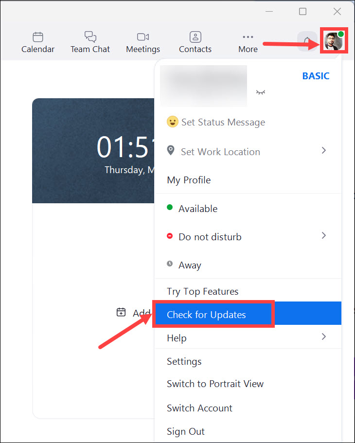 1.Zoom uygulamasını başlatın,ProfilSağ üstte simge ve seçinGüncellemeleri kontrol edin.
