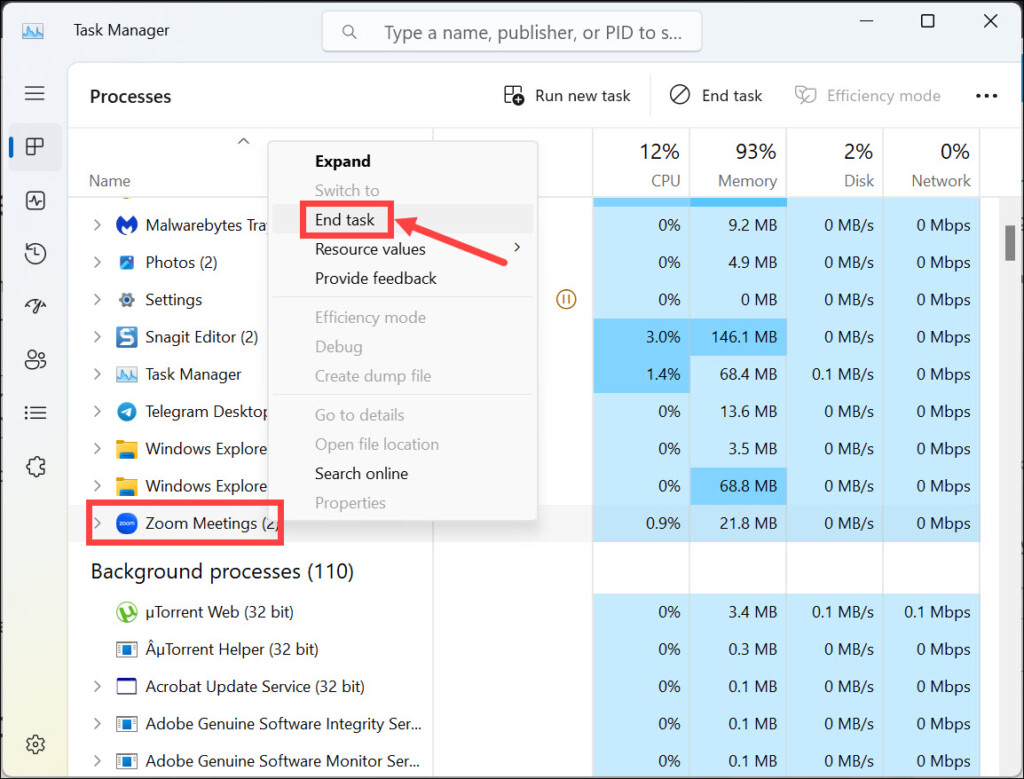 2."Zoom toplantıları"Altında uygulamaSüreçlerSekme, üzerine sağ tıklayın ve seçinSon görev.