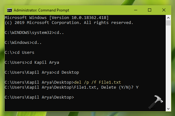 2.Komut istemi penceresinde, silmek için zorlamak istediğiniz dosyanın klasör konumuna gidin. O klasördeyken yazındel /p /f <FILE NAME>ve Enter tuşuna basın. Veya alternatif olarak, doğrudan yürütebilirsinizdel /p /f <FILE LOCATION>emretmek. Kullandığımız gibi/pparametre, bu nedenle dosyayı silerken onaylama istenecektir. Eğer istersen atlayabilirsiniz/pparamater ve doğrudan kullanındel /f <FILE LOCATION>. Dikkat/fParametre belirtilen dosyayı silmek için kullanılır.