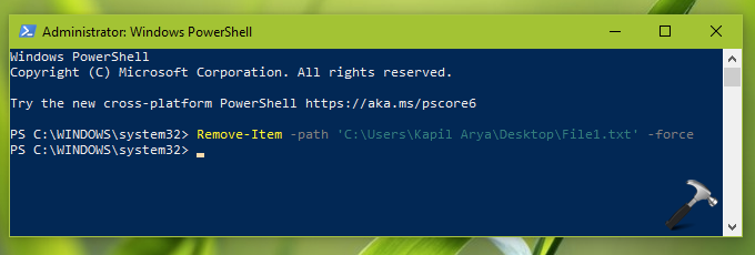 Remove-Item –path '<FILE LOCATION HERE>' - force* Yerine geçmek<FILE LOCATION HERE>Tam dosya konumu ile Sil''yi zorlamak istersiniz. Örneğin,Remove-Item –path 'C:UsersKapil AryaDesktopFile1.txt' - force. Komut alandan oluşmuyorsa, teklifleri kaldırabilirsiniz. Örneğin,Remove-Item –path C:UsersKapilAryaDesktopFile1.txt - forceçalışmalı amaRemove-Item –path C:UsersKapil AryaDesktopFile1.txt - forceDosya konumunu tırnak içine koymadıkça yürütülmez.