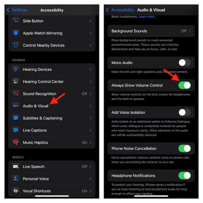 - Ayarlar uygulamasını iphone> Erişilebilirlik> 'nde başlatın, işitme bölümünün altında Ses ve Visual> Daima Ses Kontrolünü Göster için Anahtarı Dışı Bırakın.
