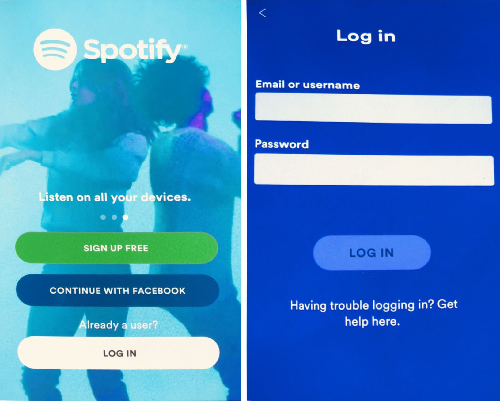Uygulamayı yükledikten sonra, sadece açın, Spotify'ı kullanıcı adınız / şifrenizle girmeniz veya Facebook giriş seçeneğini kullanmanız gerekecektir, böylece oturum açmak için Spotify kimlik bilgilerinizi girmeniz gerekecektir.