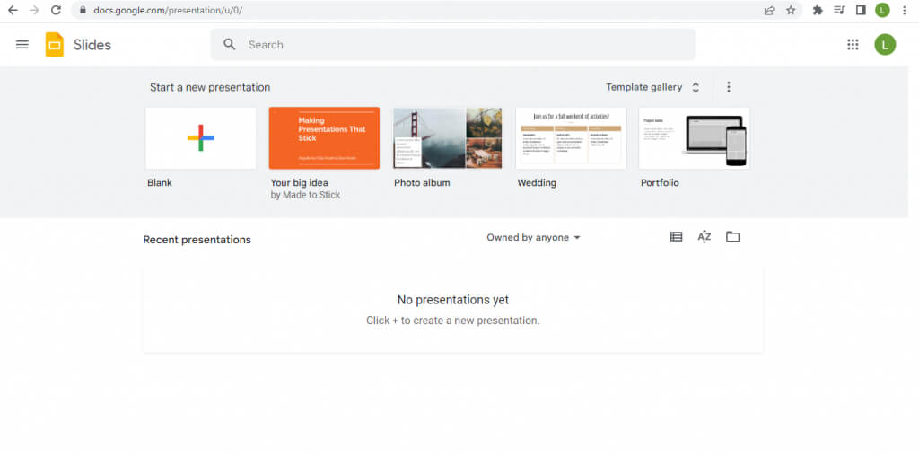 - Arayüz benzerGoogle Dokümanlarbaşlamanız için üstte şablonlar ve aşağıda listelenen mevcut projeler ile. Mevcut bir sunum açın (veya yeni bir sunum oluşturun).