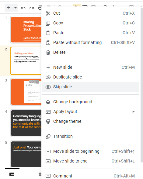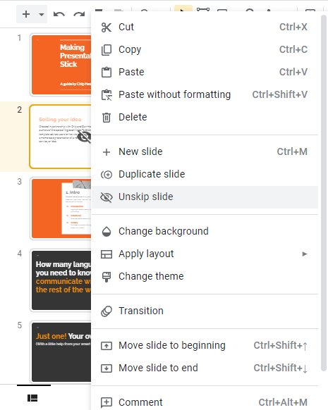 Bu nedenle Google Slaytlar, seçilen slaytları atlama seçeneğini içerir. Slayt gösterisinde oynamadığından emin olarak, potansiyel kullanım için sıkı çalışmanızı koruyabilirsiniz.