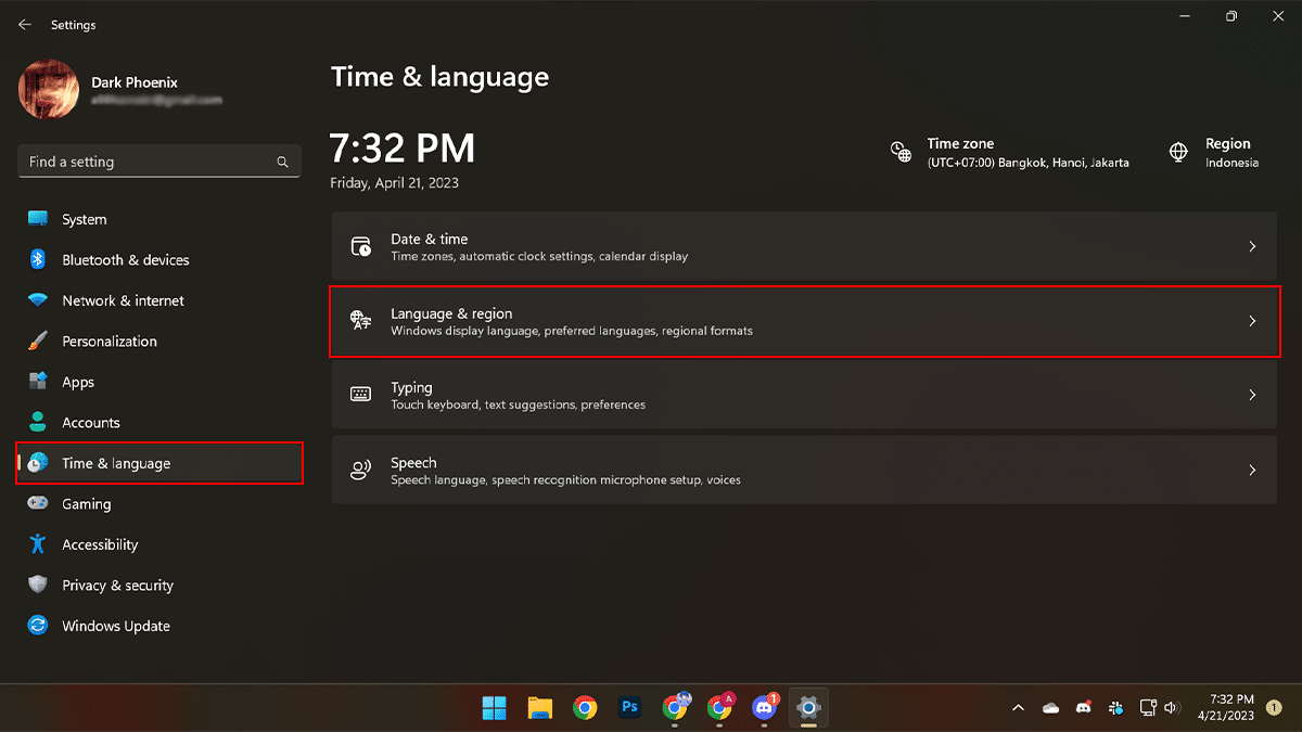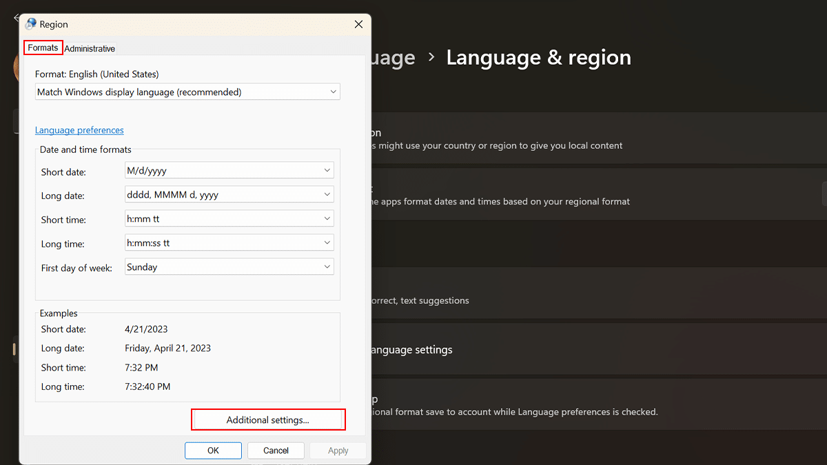 - "Zaman ve Dil”>"Dil ve Bölge”Sekmesi.