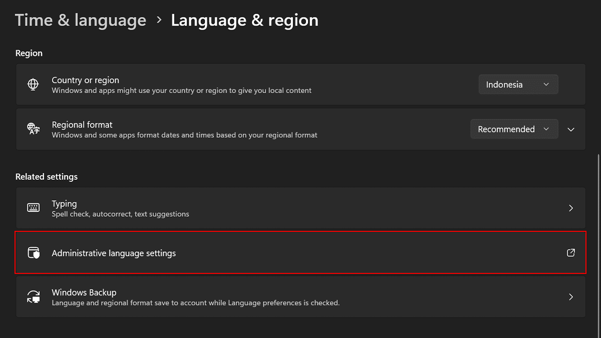 - "İlgili bağlantılar”Bölüm> Ona Tıklayınİdari dilAyarlar.
