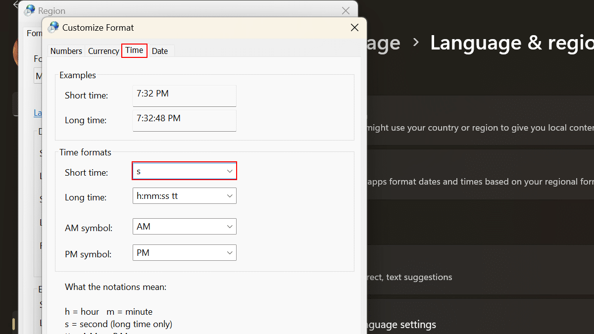 - TıklayınZamansekme> altında "Zaman biçimleri”Bölüm> Tür"S""Kısa süre"Ayar."S”Saniyeleri gösterir, ancak saniyelerden beri Windows 11'deki saati gizleyecek olan görev çubuğunda görünmez.