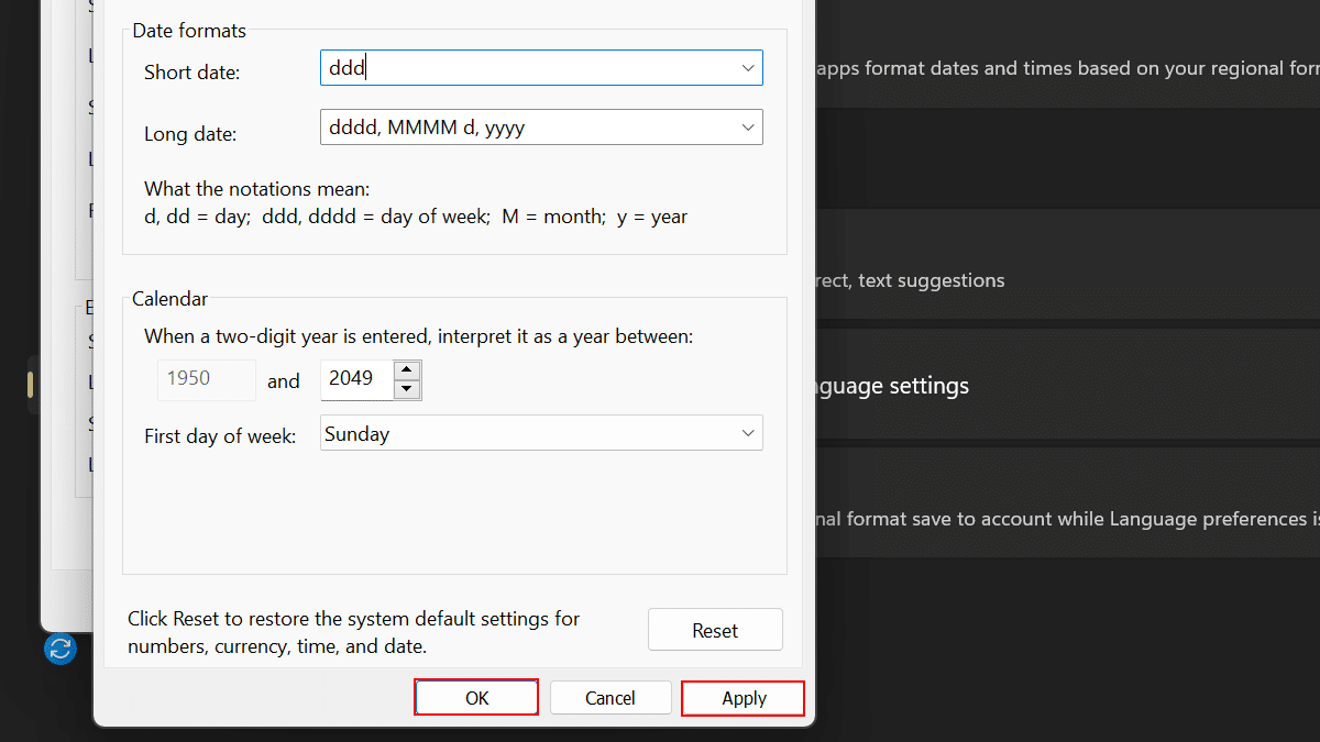 - TıklayınTarihsekme> altında "Tarih biçimleri”Bölüm> Tür"DDD""Kısa tarih" ayar.