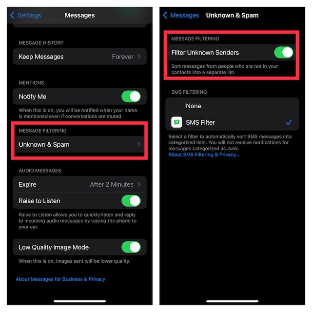 - Mesaj filtreleme bölümünün altında, bilinmeyen ve spam'e dokunun ve ardından geçişi açınBilinmeyen gönderenleri filtre edin.