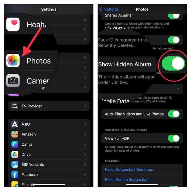2.Şimdi, yanındaki geçişi kapatGizli Albüm GösterFotoğraflar uygulamasının içinde görünmesini durdurmak için.