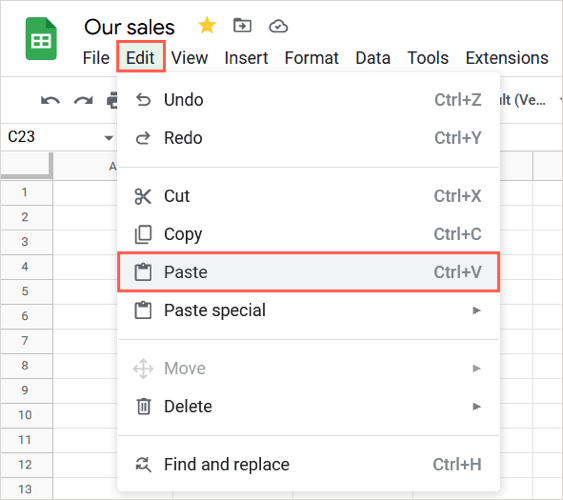 - Sembolü yapıştırmak istediğiniz hücreyi seçin. SeçmeDüzenlemek>MacunMenüden sağ tıklayın ve seçinMacunveya bir klavye kısayolu kullanın. KullanmakCtrl + Vpencerelerde veyaKomut + vMac'te.