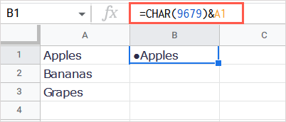 Formülü parçalamak için, mermi noktası için Char (9679), dizeye eklemek için bir ampers ve metin için A1 var.