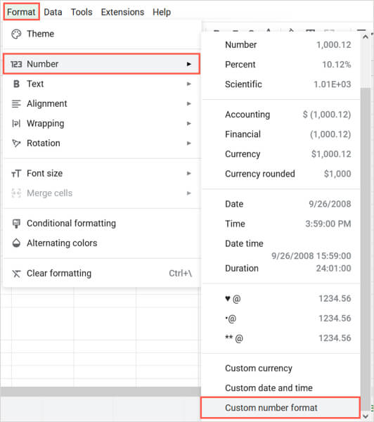 - SeçmeBiçim>Sayıve seçÖzel numara biçimiPop-Out menüsünün altında.