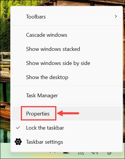 1."Görev çubuğu" na sağ tıklayın veÖzelliklerExplorerPatcher'ı başlatmak için menüden seçenek.