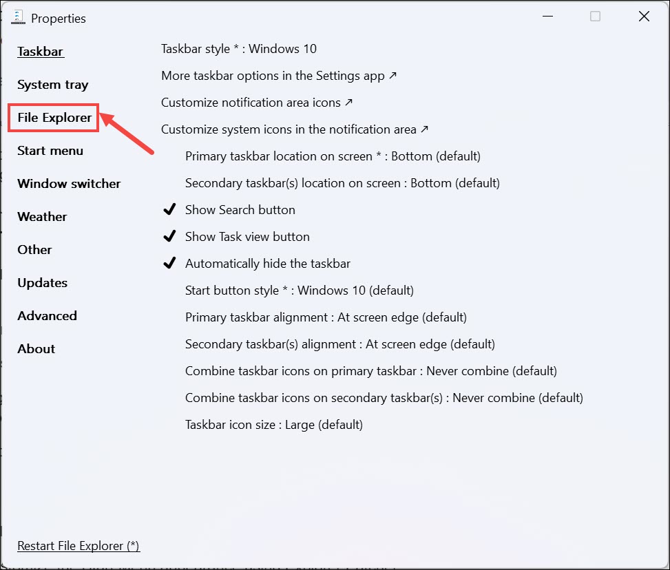 Explorer Patcher'ı kullanarak Dosya Explorer ayarlarını özelleştirmek için şu adımları izleyin: