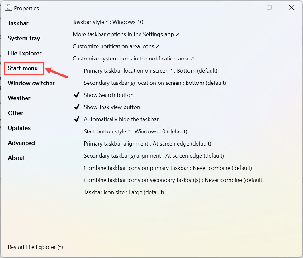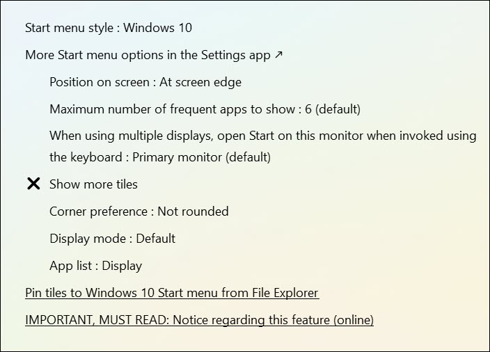 Başlat menüsü görünümü: Kullanıcılar Explorer Patcher'ı kullanarak başlangıç menüsünün görünümünü değiştirebilir. Bu, Windows 10 stiline geri dönüştürmeyi içerir. Başlat menüsünü özelleştirmek, kullanıcıların iş akışlarına ve stillerine göre uyarlamalarını sağlar.