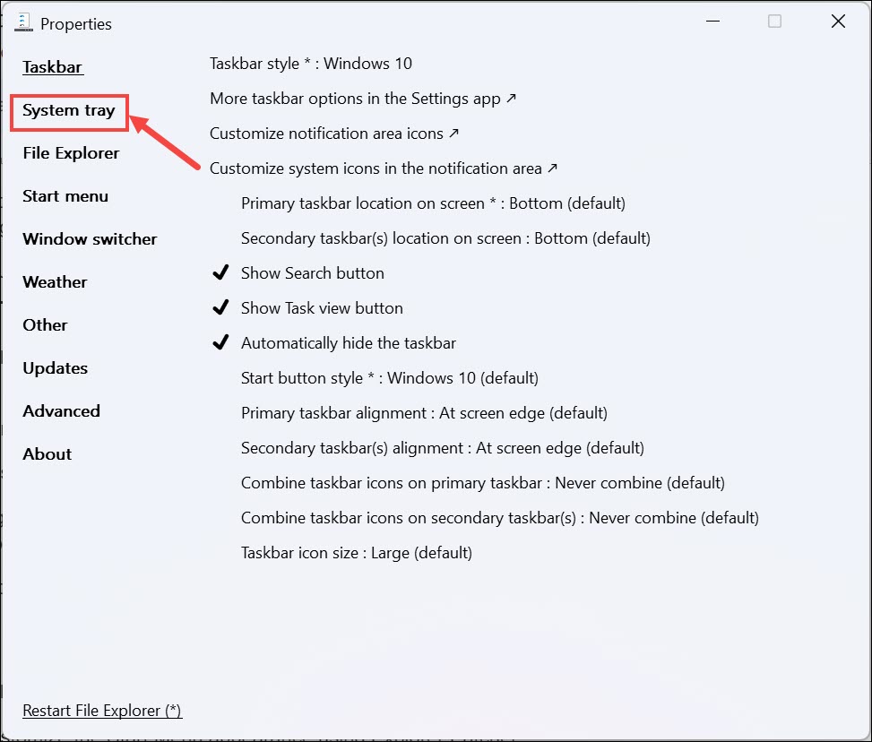 Sistem tepsisi, şu anda aktif veya en çok kullanılan uygulamaların simgelerini içeren Extreme Right'ta bulunan görev çubuğunun bir parçasıdır. Ayrıca saati görüntüler. ExplorerPatcher ayrıca sistem tepsisini yapılandırmanıza izin verir.