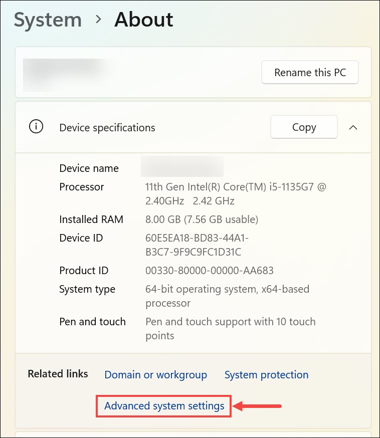 3.Hakkında bölümün altında,:Gelişmiş Sistem Ayarları”Sol taraf menüsünden. Bu Sistem Özellikleri penceresini açacaktır.