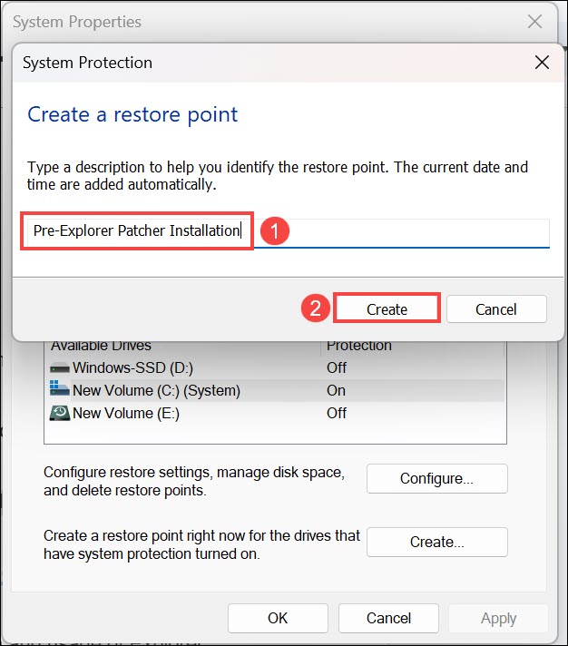 ExplorerPatcher'ı yüklemeden ve kullanmadan önce bir Windows 11 Geri Yükleme Noktası Oluşturun