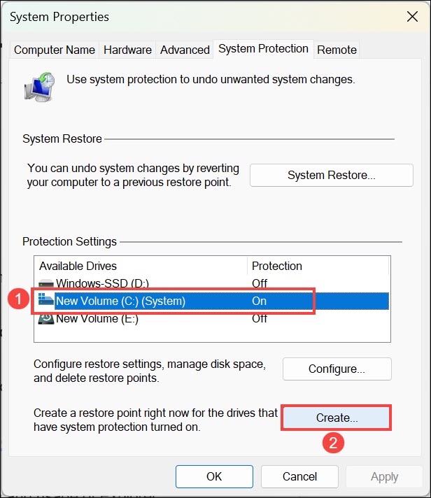 4.Sistem Özellikleri penceresinde,Sistem korumasıSekme, sistem sürücüsünü seçin veYaratmakdüğme.