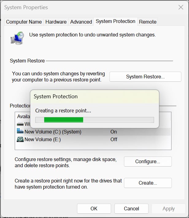 7.Birkaç dakika sonra, sistem geri yükleme noktası oluşturulacaktır.