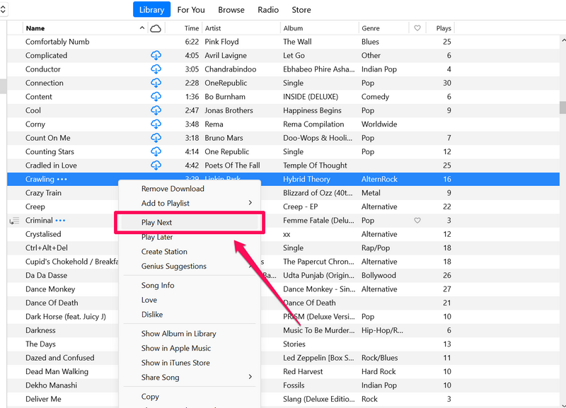 6.Ayrıca yapabilirsinizSize yeni şarkılar ekleyin Sonraki ListeileOnları sağ tıklamakve seçmekSırada OynayınBağlam menüsünde seçenek.