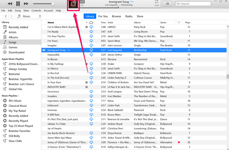 2.İTunes uygulamasını göreceksinizMini müzik çalarına dönüşsadeceAlbüm kapağıMevcut şarkının veŞarkının başlığı, yüzen bir pencerede görünen.