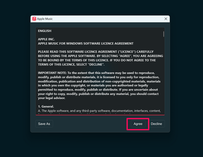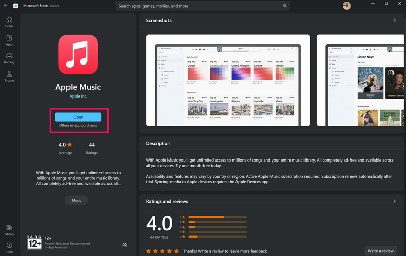 5.Tamamlandıktan sonraAçıkbutonApple Music uygulamasını başlatınWindows 11 PC veya dizüstü bilgisayarınızda.