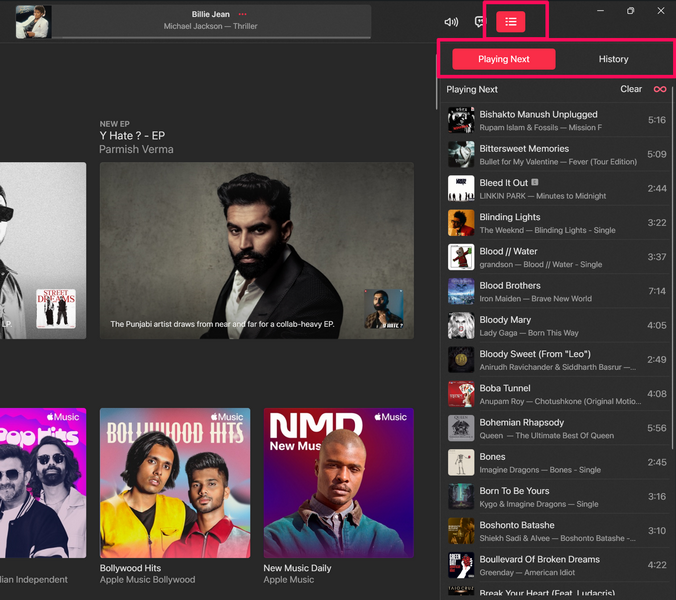 7.Bundan sonra varKuyruk düğmesiBu bir kenar çubuğu açar, yaklaşan şarkıları ve şarkı geçmişinizi gösteren,Sonraki OynamaVeTarih.