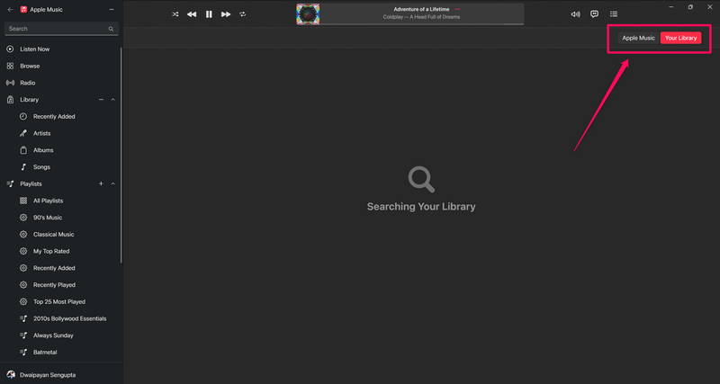 10.Bir şarkı aramak için arama çubuğunu tıkladığınızda,Apple Music kütüphanesinin tamamını aramayı seçinveyaKişisel Müzik Kütüphanenizözel düğmeleri kullanarak.
