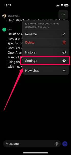 2.Ancak, mevcut sohbeti bitirmek ve iOS için ChatGpt'te yeni bir sohbet başlatmak istiyorsanız,üç noktalı düğmesağ üst köşede.