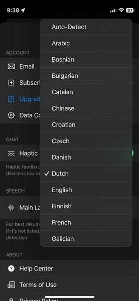 4.Şimdi yapabilirsinTercih ettiğiniz dili seçinAçılır listeden ve iOS'taki ChatGPT uygulaması için birincil dil olarak ayarlamak için dokunun.