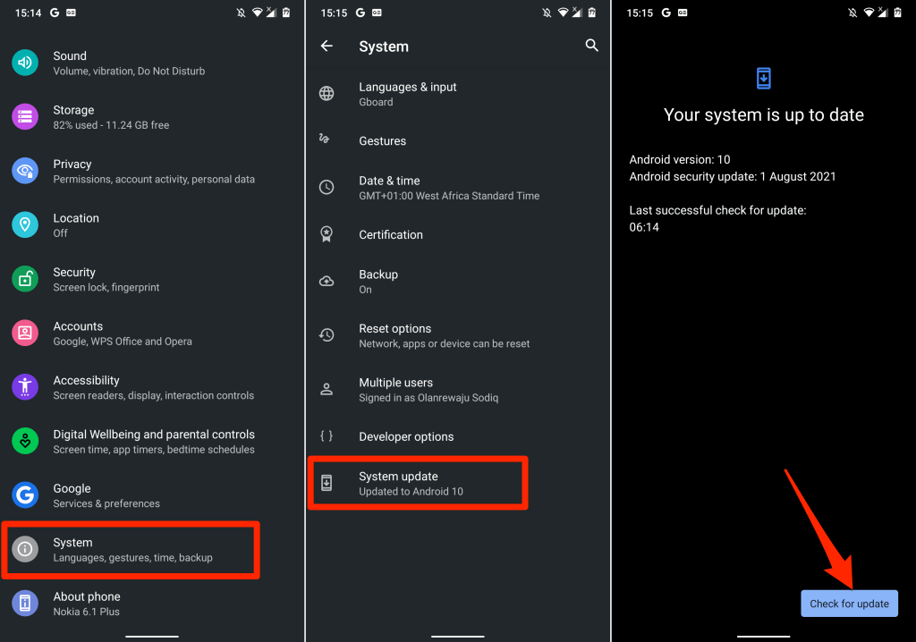 Gidip gelmekAyarlar>Sistem>Gelişmiş>Sistem güncellemesiVe muslukGüncellemeleri kontrol edinAkıllı telefonunuz için mevcut en son Android sürümünü yüklemek için.