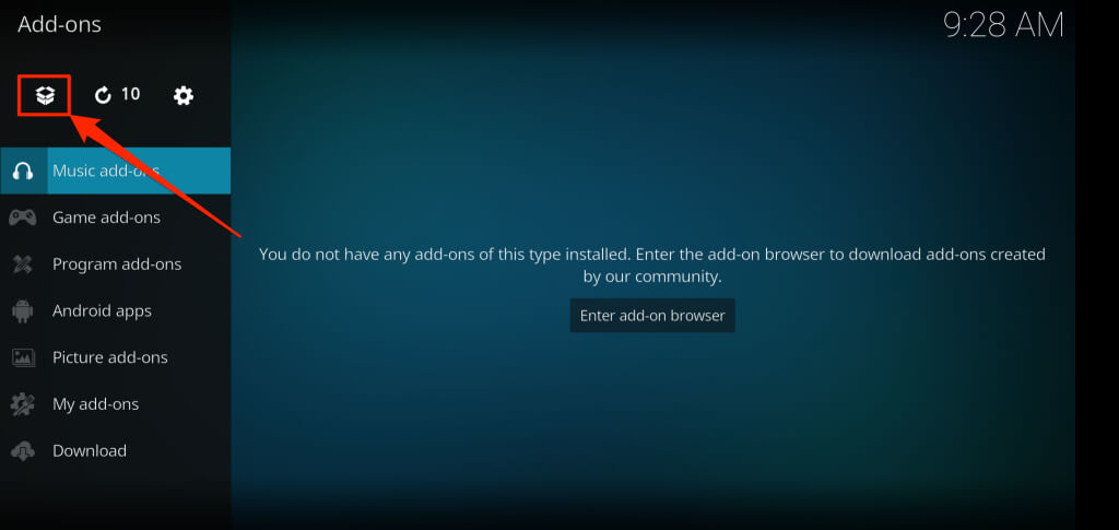 Kodi'nin uygulama içi deposunun dışına indirilen bir eklenti yüklemeden önce, medya oynatıcıyı üçüncü taraf kaynaklardan eklentilere izin verecek şekilde yapılandırın. Eklentiyi üçüncü taraf repodan (zip biçiminde) indirin ve yüklemek için aşağıdaki adımları izleyin.