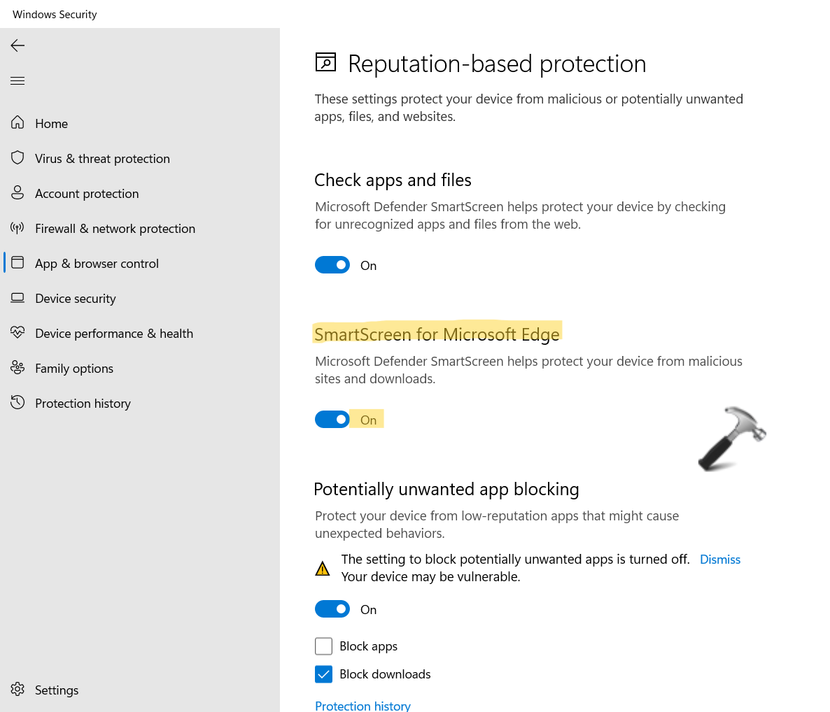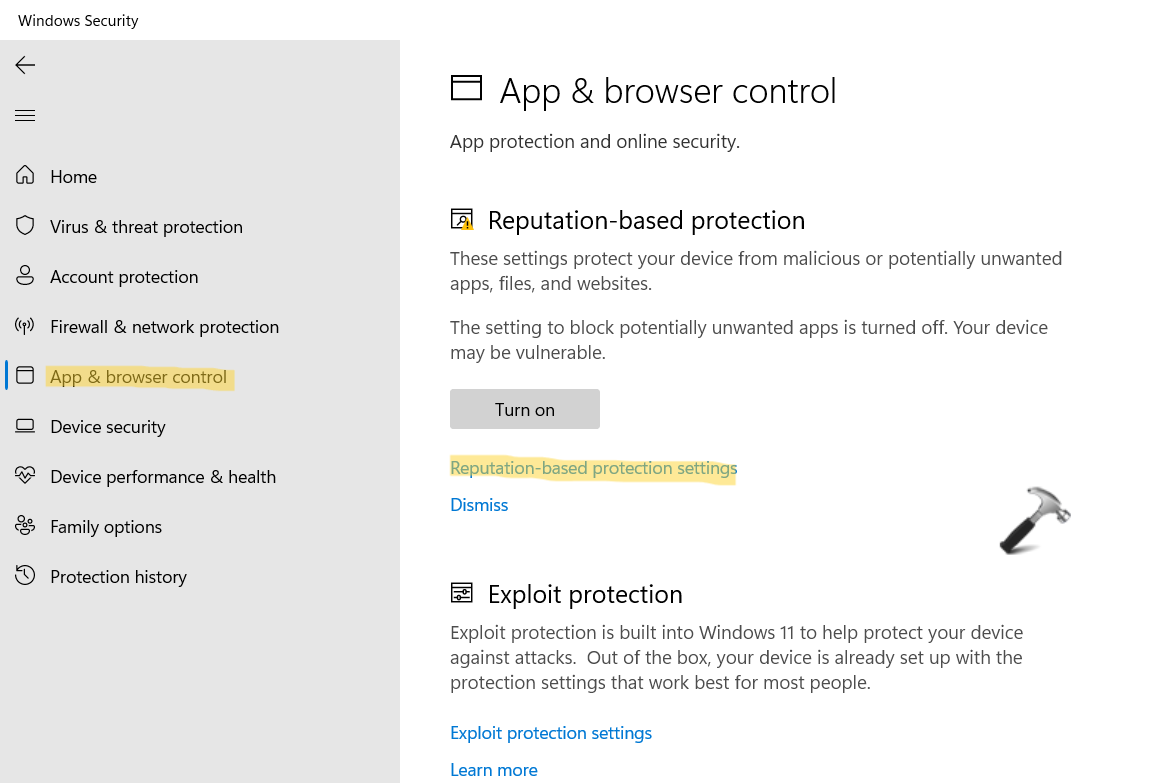 - İlk olarak açıkWindows GüvenliğiVe sonra,Uygulama ve Tarayıcı DenetimiBundan sonra tıklayınİtibar tabanlı koruma ayarları.