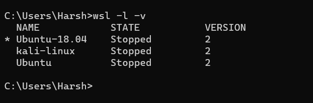 Varsayılan WSL sürümü şimdi değiştirilmelidir. Geçerli WSL sürümünü kullanarak kontrol edebilirsiniz.WSL -L -Vemretmek.