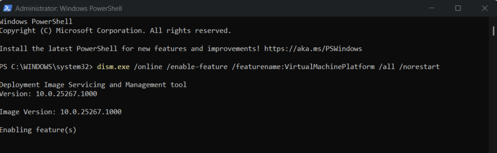 dism.exe /online /enable-feature /featurename:VirtualMachinePlatform /all /norestart