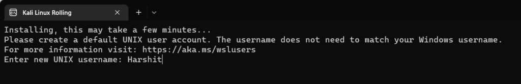 3.Önce Linux'unuz için kullanıcı adını ayarlamanızı isteyecektir. Yani, yazınkullanıcı adıayarlamak istiyorsun ve basınGirmek. Kullanıcı adını Windows kullanıcı adınızla aynı tutmanız gerekmez.