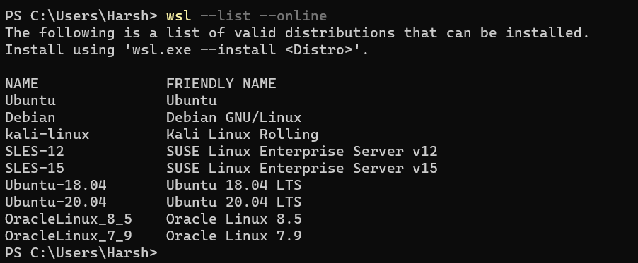 2.Artık yüklenebilecek tüm Linux dağıtımlarının listesini göreceksiniz. Bahsedilen komutu konsolda yürütmeniz ve<Distro>ileLinux DağıtımYüklemek istiyorsun.