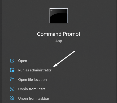 1.AçWindows Arama Kutusu, tipKomut istemive seçinYönetici olarak çalıştırsonuçlardan seçenek.