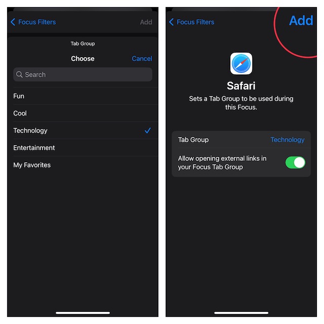 7.Bu ekranda, oluşturduğunuz Safari sekme gruplarının bir listesini görmelisiniz. Son olarak, istenen sekme grubunu seçin ve ardındanEklemekbitirmek için ekranın sağ üst köşesinde.
