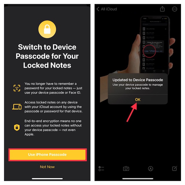 7.Kimlik doğrulama yapıldığında, “Cihaz Parolama Koduna Güncellenir. Kilitli notlarınızı yönetmek için aygıt şifresini kullanın.” DenemekTAMAMBitirmek için açılır pencere.