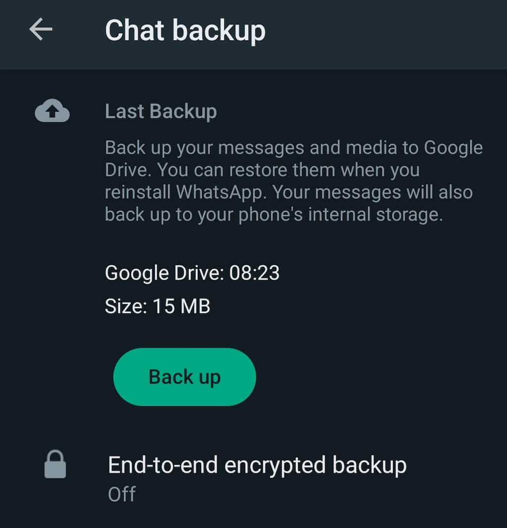 - Yolu takip edinSohbetler>Sohbet yedeklemesi>Şimdi yedekleYedeklemeyi başlatmak için.