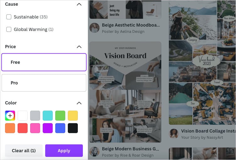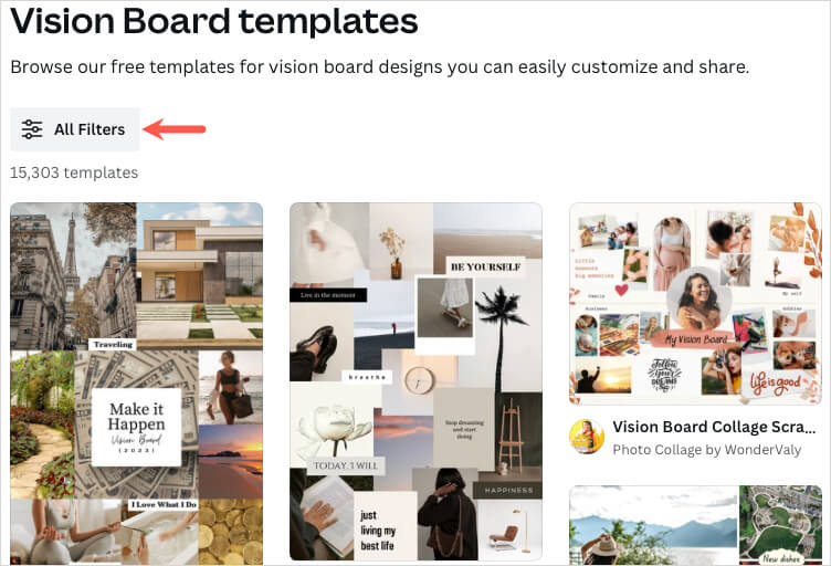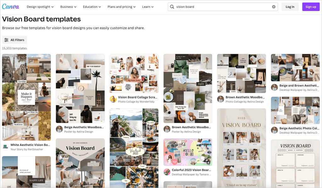 - Şablonlara göz atmak içinCanva'da Vision Board Şablonları Sayfası. Bir şablon bulmadan önce veya sonra Canva hesabınıza giriş yapabilirsiniz.