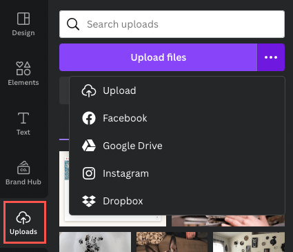 Kendi resimlerinizi yüklemek için seçinYüklersoldaki. Sağdaki üç noktayı kullanınDosyaları YükleBilgisayarınızdan, Facebook, Google Drive, Instagram veya Dropbox'tan birini seçmek için.