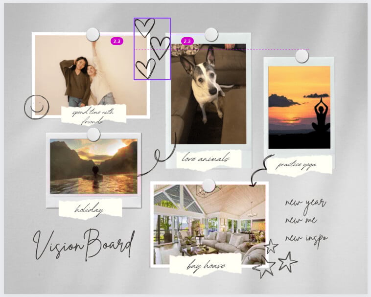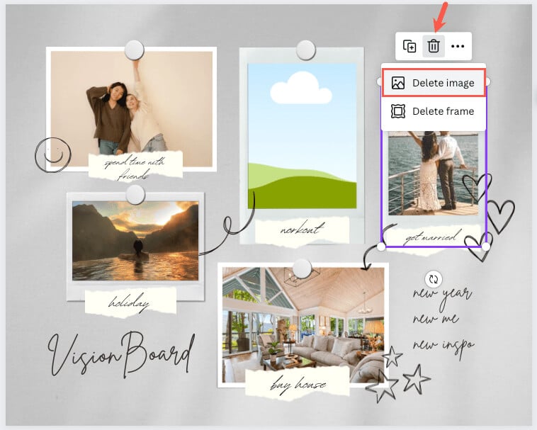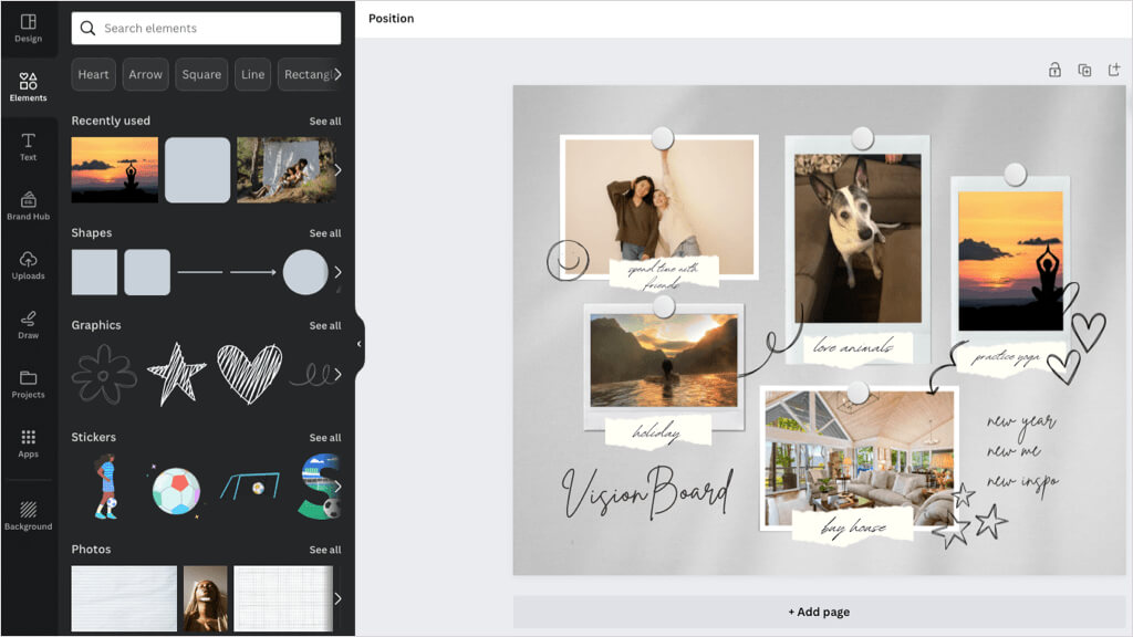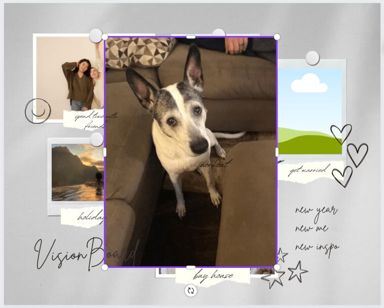 Vizyon kartınıza istediğiniz herhangi bir öğeyi ekleyebilirsiniz ve aslında yapmalısınız. İster başka bir görüntü, ister bir çıkartma veya grafik veya bir çerçeve veya şekil olsun, istediğiniz öğeyi seçmek için kenar çubuğundaki Canva kütüphanesini kullanın. Ardından, tahtaya seçin veya sürükleyin.