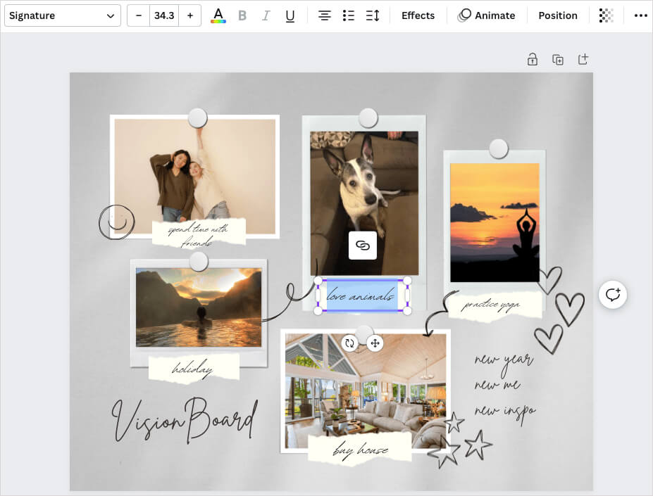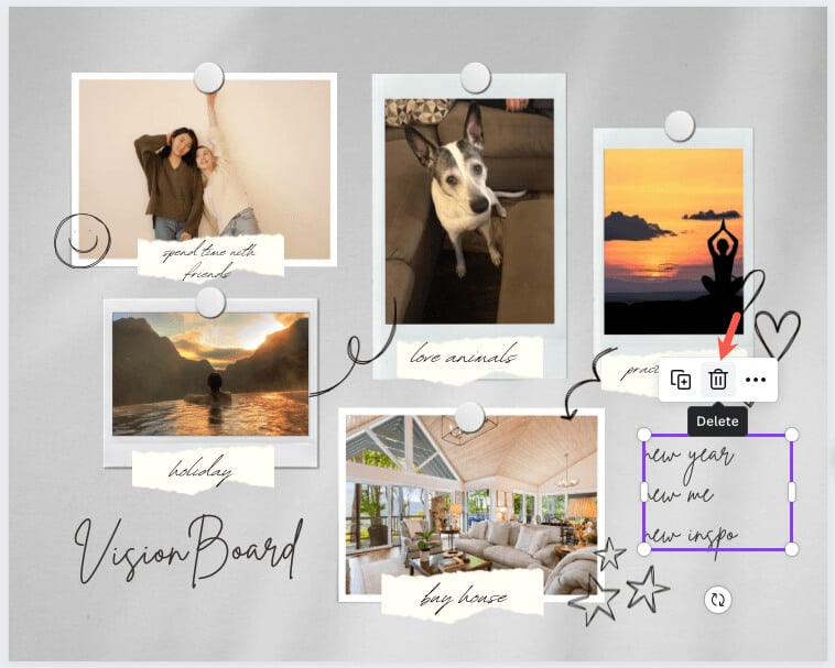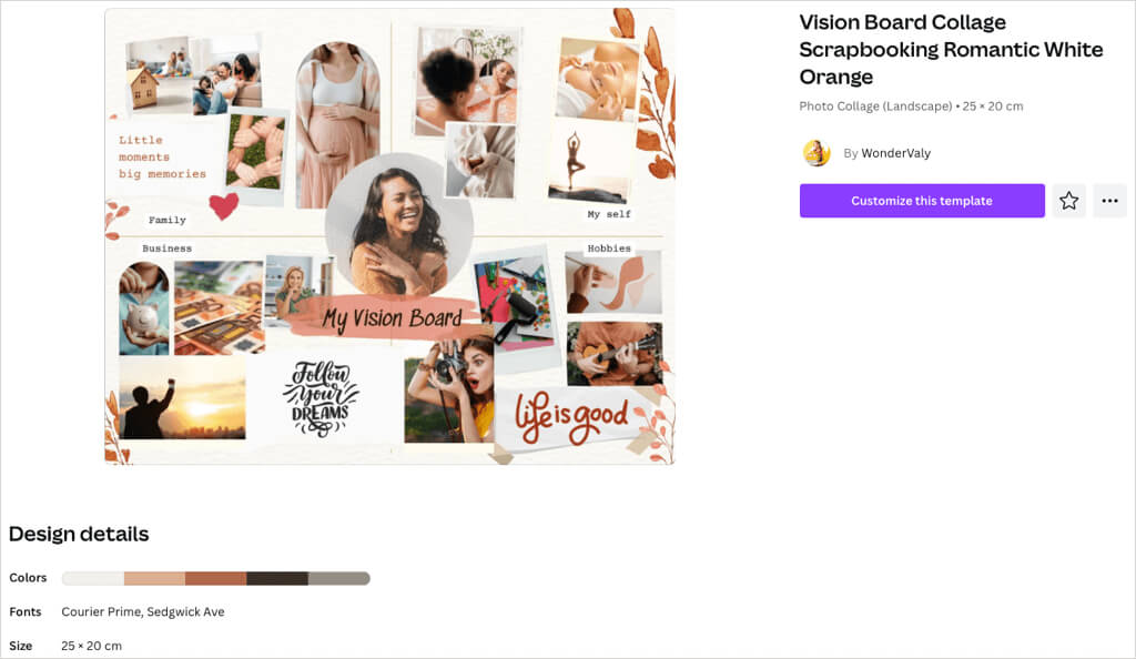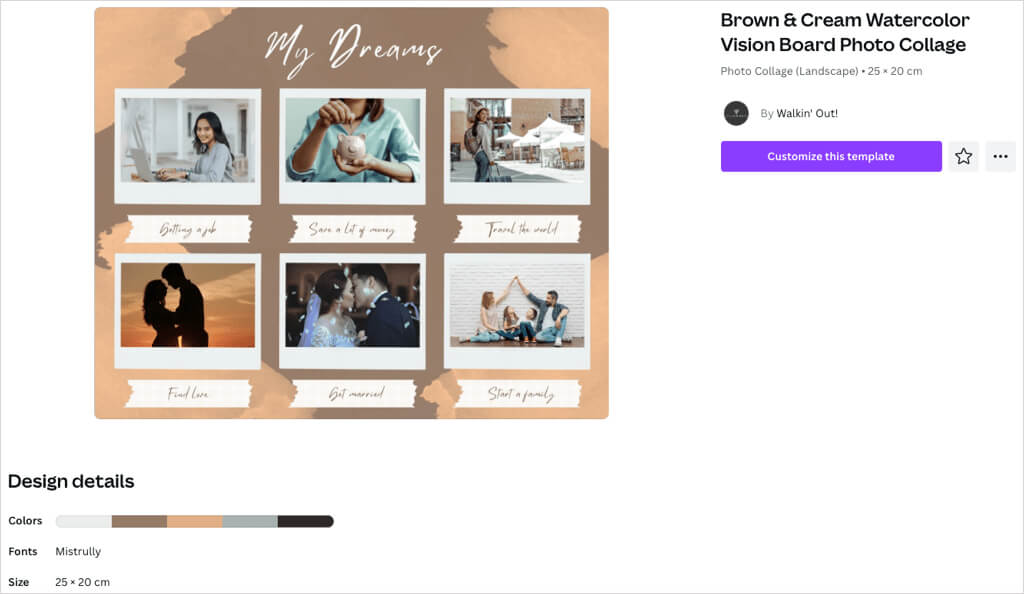 Vizyon kartınızı oluşturmak için bir Canva şablonu kullanarak, temel bir tasarımla başlayabilir ve ardından oradan özelleştirebilirsiniz. Bu, yapı yerine dahil etmek istediğiniz öğelere odaklanmanız için size daha fazla zaman verir.