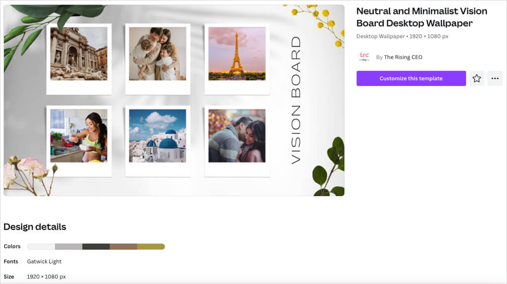 Canva'yı mevcut özellik setinin yanı sıra çekici bir seçenek yapan şey, Vizyon Board şablonları sunmasıdır. Bu, bir vizyon tahtası oluşturmaktan zaman kazandırır, ancak aynı zamanda kartınızı en çok istediğiniz şekilde özelleştirmenize olanak tanır.