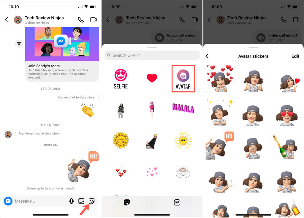 SeçmeAvatarVe sonra kullanmak istediğiniz ifadeyi seçin. Çıkartma, Instagram dostunuza mesaja inecektir.