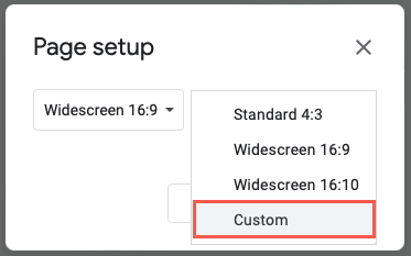 - Ziyaret etmekGoogle Slaytlar, sunumunuzu açın,Dosyamenü ve seçSayfa kurulumu.